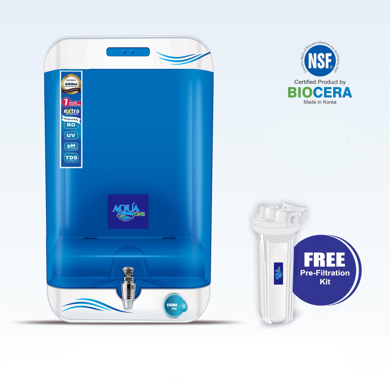 AquaOne CROMA Plus an advanced water purifier that uses Reverse Osmosis and Ultra Violet Sterilization technology to provide uncontaminated purified drinking water. This RO + UV Water Purifier employs a seven stage filtration. It comes with An in-built storage tank of 13 Liters capacity. It ensures uncontaminated water and the Alkaline Anti Oxidant Filter Cartridge is to provide high quality purified Alkaline drinking water. AquaOne Alkaline Water Purifier uses original patented Biocera AA Antioxidant Alkaline Water Filter, certified by NSF International against NSF/ANSI standards.