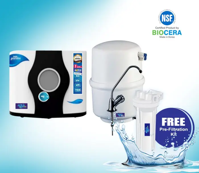 AquaOne EURO Plus an advanced water purifier that uses Reverse Osmosis and Ultra Violet Sterilization technology to provide uncontaminated purified drinking water. This RO + UV Water Purifier employs a seven stage filtration. It comes with An in-built storage tank of 10 Liters capacity. It ensures uncontaminated water and the Alkaline Anti Oxidant Filter Cartridge is to provide high quality purified Alkaline drinking water. AquaOne Alkaline Water Purifier uses original patented Biocera AA Antioxidant Alkaline Water Filter, certified by NSF International against NSF/ANSI standards.