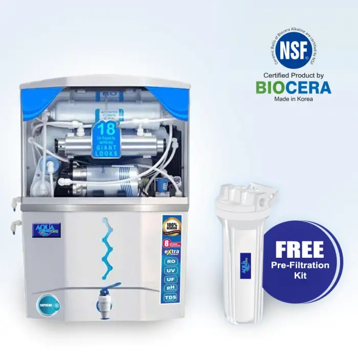 AquaOne SUPREME an advanced water purifier that uses Reverse Osmosis and Ultra Filtration technology to provide uncontaminated purified drinking water. This RO + UV Water Purifier employs a eight stage filtration. Retention of essential minerals are controlled by using a TDS Controller. It comes with an inbuilt storage tank of 18 Liters.